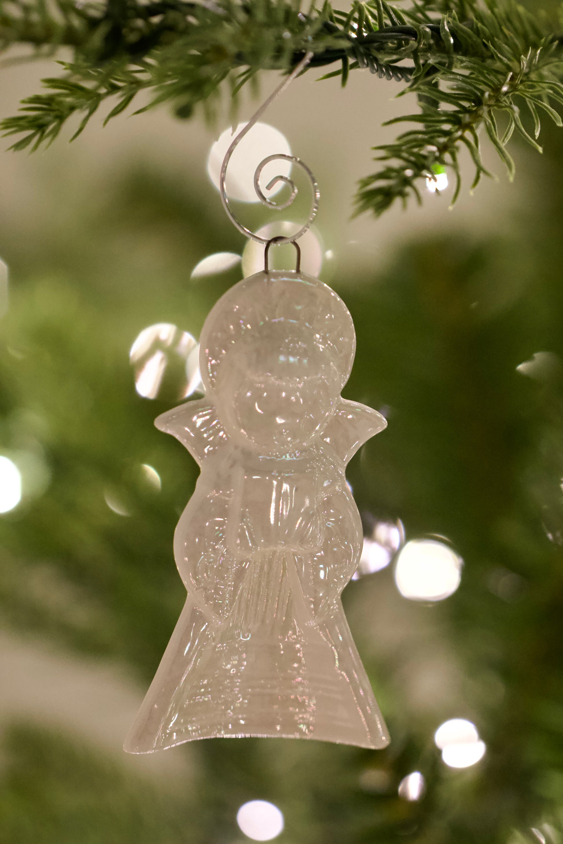 Each angel is hand-poured, fired, and finished in small batches, allowing natural variations in glaze and surface to appear. The rainbow swirls created by mother-of-pearl emerge after the final, third, firing making every ornament truly one of a kind. These details aren’t added, they happen naturally in the kiln, and they’re part of what gives each piece its quiet magic.